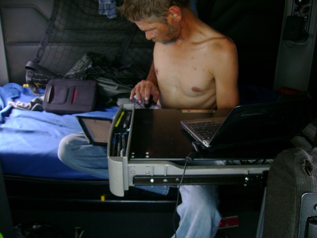 when I can find the time (sometimes it piles up for a couple of days). I look over my next trip, and see how long I estimated, using my Microsoft Maps & Streets. Finally, it is time to straighten up my bunk area, and start up the EMachine that records and tracks the days movement of the truck (it is also the faithful “underdog” that runs the Skype program efficiently). Time to switch gears. While the second machine is starting up, I begin my Pre-Trip of the truck and trailer. I hop in the truck a couple of times for my air gauge or rag, reaching over to plug in the Earthmate (into the EMachine). With all Fluid, tire pressures, physical structure of both vehicles (a trailer is technically a vehicle…it is registered by States), I return to my Driver’s Daily log to make sure I log it as I go. My day has begun. Along the way, with every pickup and delivery, the main computer is turned on to record the load information, the stops for fuel, and the driver’s daily log, as a Log it as I go (that means for every time the driving status changes, I catch up on my log), and finally open my Microsoft Streets and Maps, and update each stop time, and see if I am still on track. This also givers me the opportunity to check out my route I chose to drive. By the end of the day, I record my ending mileage, fill in the miles driven, work hours, and driven time, the recap table, and it is time to do a post trip. The computer typically is shut off, after I submit my Post-Trip information (and any maintenance repairs done during the day), updating my Microsoft